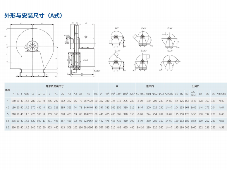 4、出風口:氣體流出通風機的通道,出風口上鉆有螺栓孔,可與風管連接。
